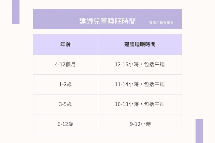 究竟兒童一天需要多少睡眠,應該幾點上床呢? 雖然每個人的生理時鐘都不同,臺灣兒科醫學會建議的兒童睡眠時間如下: