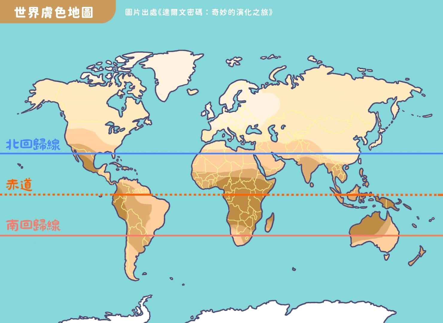 我們觀察世界膚色地圖可以發現,在北半球的歐洲、北美等地區,人們的平均膚色比較淺,而在靠近赤道的南半球,像是非洲、南美和大洋洲地區,人們的膚色就比較深。這是因為地球公轉角度的變化,導致了光照的差異。
