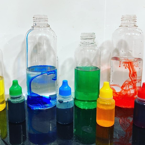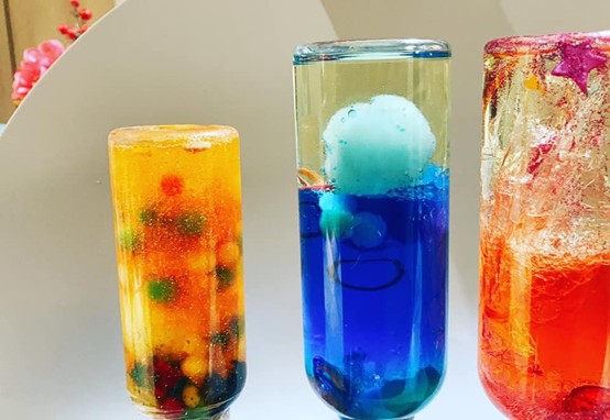 最簡單的就是在油水按比例加入後,加入不同顏色的金蔥,和膠水,這樣整瓶不但因油水分離,而層次鮮明,又有金蔥閃爍、慢速浮動,也如同水晶球和星空般閃閃動人,慢速流動的靜謐感非常療癒。