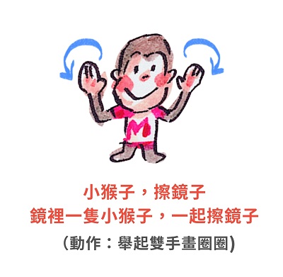 鏡裡一隻小猴子,一起擦鏡子 (動作:舉起雙手畫圈圈)