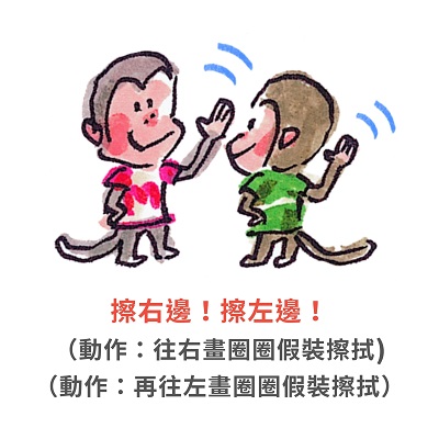 擦右邊!擦左邊!(動作:往右畫圈圈假裝擦拭,再往左畫圈圈假裝擦拭)