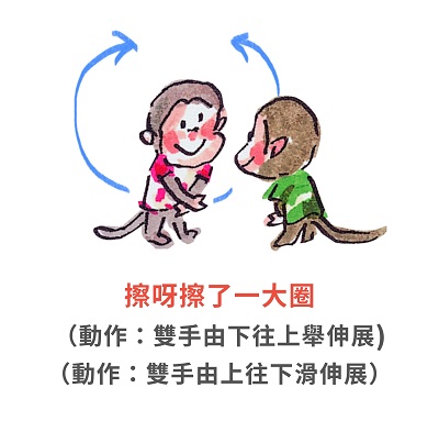 擦呀擦了一大圈(動作:雙手由下往上舉伸展,雙手由上往下滑伸展)