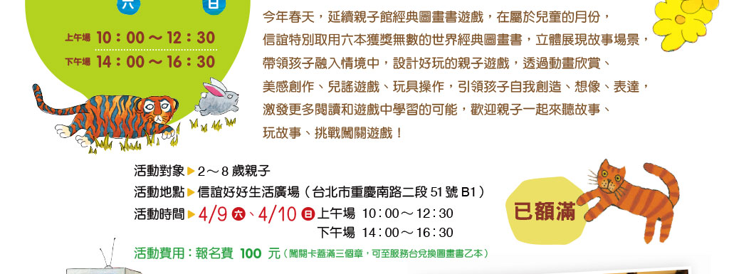 4/9(六)、4/10(日)【經典圖畫書好好玩!】親子園遊會開放報名囉!一起來聽故事、玩故事、動手DIY,把圖畫書帶回家~